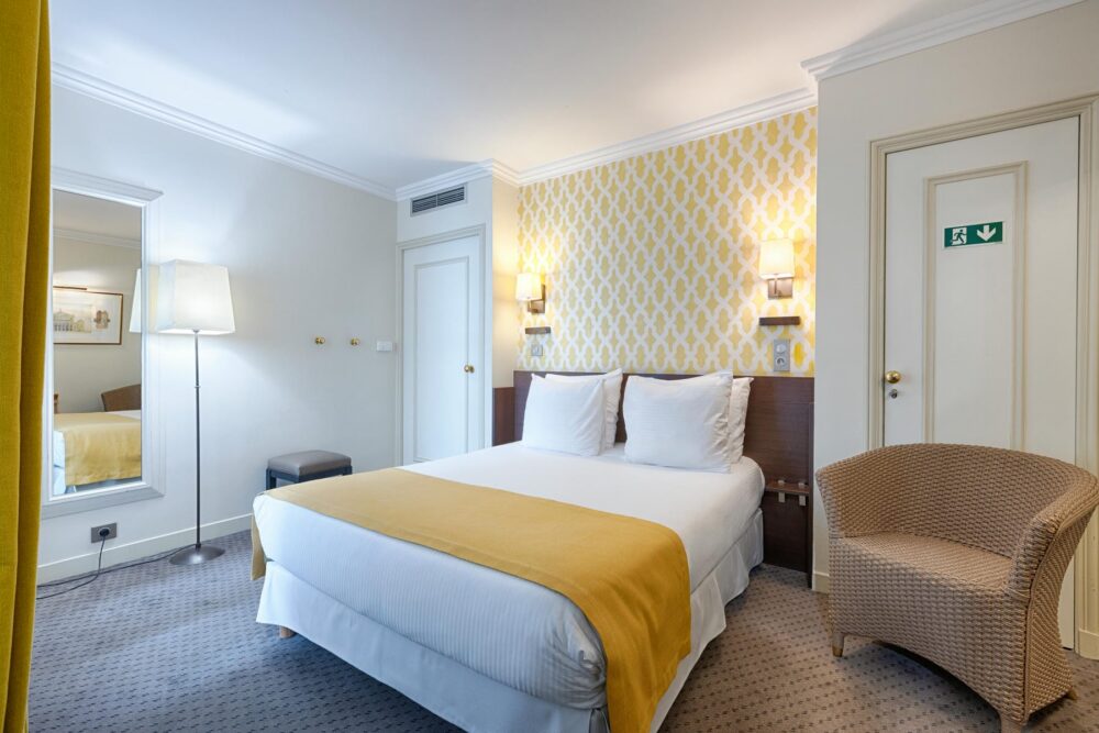 Pensée pour les couples comme pour les voyageurs en solo, notre chambre double allie pour vous le confort et la praticité. Avec son lit 160×200 cm, sa literie premium, sa climatisation, son Wi-Fi gratuit et sa télévision à écran plat, elle vous propose un cadre pratique et agréable au cœur de la Ville Lumière.