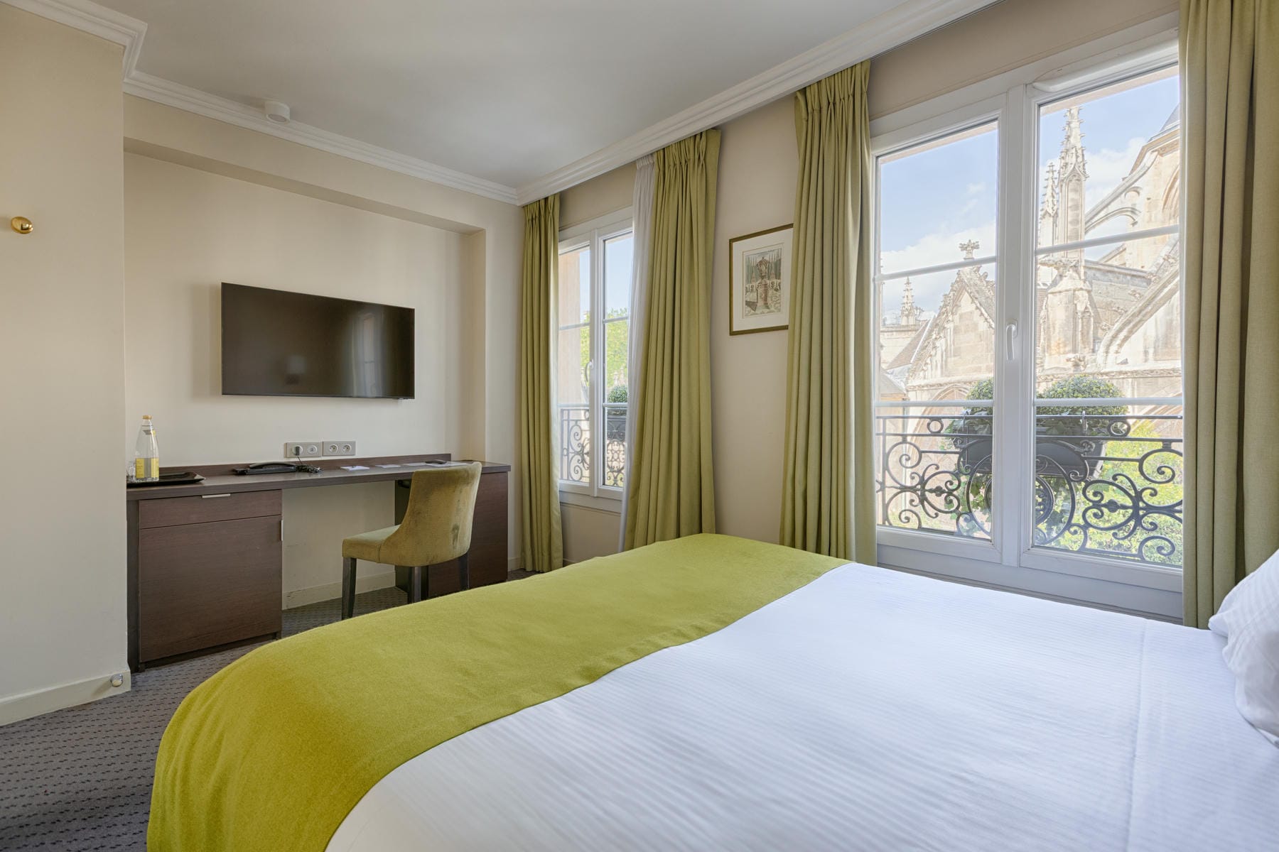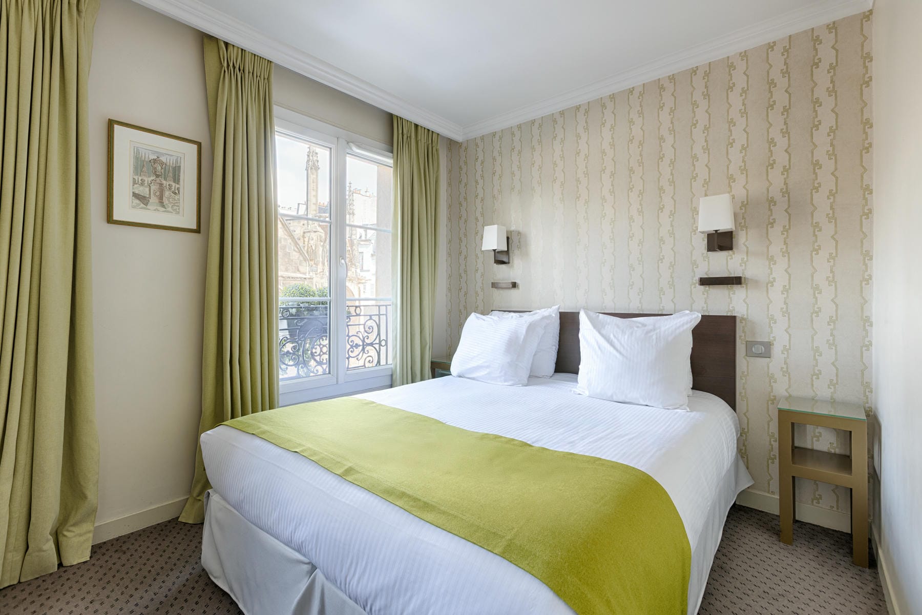 Prolongez la magie de Paris directement depuis votre fenêtre ! Selon la chambre, votre regard se posera sur les toits typiquement parisiens ou sur l’église Saint-Séverin. Pour une tranquillité maximale, nos chambres côté cour sont un véritable havre de paix.